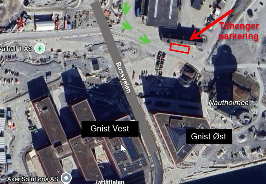 Tilhengere står ved parkering tilhørende Gnist Østbyget i Jåttåvågen, hentes og leveres der 24/7 men nøkkel utleveres i resepsjon i Vestbygget i respesjonens åpningstider.